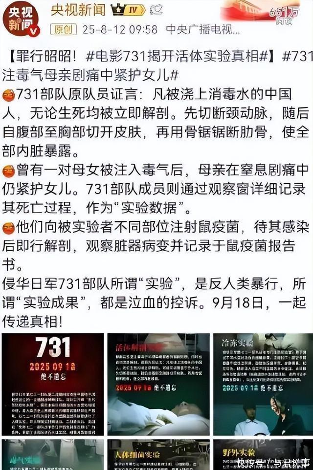《731》上映那天哈尔滨影院门口的风真硬,刮得人脸生疼,没几个人排队,进去的有年轻人,也有上了年纪的,看的时候全场没一点声,就听见后排一个小伙子一直在抽纸。       电影结束灯一亮,他眼圈通红,走廊里一个大哥拍着边上人的肩膀,想说点啥,半天憋不出一句话,这片子也没个宣传,朋友圈就传一句话,去看看,千万别带孩子。       《731》这项目就没按套路来过,人家电影都是热搜营销,谁跟谁的感情线,滤镜拉满,主角一个比一个好看,这部片子啥都没有,演员也叫不上名,都是坐冷板凳的,拍戏的地方就是当年的旧址。       哈尔滨冬天零下三十多度,导演说拍一场解剖的戏,那个道具娃娃假得不行,他扭头把自己刚出生的孩子抱过来了,他老婆就在旁边看着,说孩子能有啥事,你这是干正经事。       演员的手冻得又红又肿,一分钱片酬不要,自己跑去日本找老兵,翻故纸堆,十几年就这么耗着,才有了这个本子。       日本那边一看到定档的消息,文部省马上就跳出来,说这电影是在挑动民族情绪,破坏地区稳定。       没񙷈天,好几个地方的中小学就改了历史课表,还搞什么安全演习,借口是中国人的情绪可能会失控,他们心里还是怕,怕这段历史被人翻个底朝天,怕中国人把当年的事都想起来,以后在国际上就不好说话了。       国内这边开始也不顺,定好的档期撤了又上,来来回回地审,平台也不敢给流量,说题材太扎心,影响不好,好像两边都不愿意提这。       总有人觉得这玩意儿没人看,可电影院灯一关,谁都不吱声了,片子放到一半,那抽泣声就没停过,根本不是没人想看,是以前没人敢这么拍。       这么多年抗战的片子拍了一堆,真敢�搬上来的没几个,都怕审不过,怕惹一身腥,这次是硬来的,看着是真难受,可难受也得看,有些历史你捂不住。       这些年日本的教科书改来改去,二战那点事能淡化就淡化,想让下一代记住的是什么昭和时代的美。       忘了南京,忘�,中国这回不惯着了,有啥说啥,你想洗白,我们就把事儿拿出来讲,这不是为了恨谁,是得有说话的权利,不能让你牵着鼻子走。       外交部的林剑回应得也干脆:       中国隆重举行纪念中国人民抗日战争暨世界反法西斯战争胜�周年活动,目的是铭记历史、缅怀先烈、珍爱和平、开创未来。相关题材影视作品,也是提醒世人以史为鉴,维护和平。       言辞够犀利,也句句说到了观众的心坎里。       中国人拍自己的电影天经地义,这不冲着谁去,别的国家也应该正常看待历史,没喊口号,没对骂,态度就摆在那,历史不是你说翻篇就翻篇的。       有人说这片子是消费国难,有人嫌它拍得太直接,争议确实不少。       这也说明它不是那种套路化的教育片,它就是一根针,扎到痛处了,看完没啥感动,就是疼。       历史本来就不是温情脉脉的,电影里那冰冷的手术刀,零下三十多度冻僵的手,就是要让你记住,有些事永远过不去。       这电影能不能留下来,跟票房拿不拿奖没关系。       它就是把我们一直不敢看的那一页给掀开了,让现在的年轻人知道石井四郎是谁,也让日本人明白我们不会再和稀泥,更让我们自己人记住:       民族复兴不光是看经济数字,是看你敢不敢面对自己的伤疤,告诉全世界,这就是我们的历史。       以后可能还会有南京,有被欺辱的中国印记,有三光作战的电影出来。       有争议不怕,怕得罪人那才是真完了,中国人是要和平,不等于谁把我们撕碎了我们还能忘了,不怕你抗议,就怕我们自己人都不出声了。